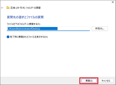 | 3. | 「展開先の選択」ダイアログボックスが表示されるので、解凍したファイルを保存するフォルダーを指定します。 | |