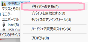 | 6. | 「不明なデバイス」と表示されている箇所を右クリックして「ドライバーの更新」を選択します。 | |