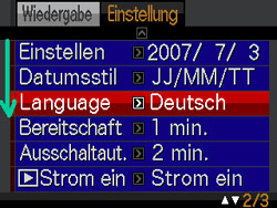 次に、コントロールボタンの下側【▼】を押し、一覧から【Language】を選択(Fig.2)し、コントロールボタンの真中にある【SET】キーを押す。 |